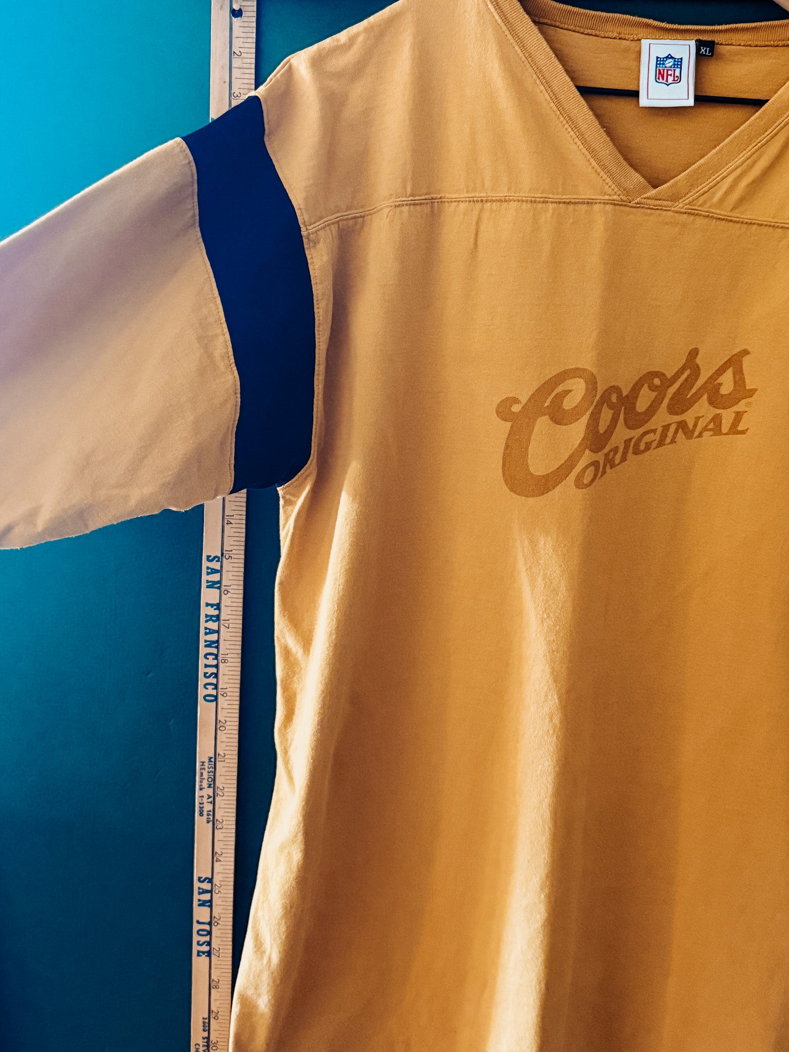 Goldenrod vibes and dusty nostalgia—the kind of shirt made for tailgates, cool fall evenings, and hanging in flannel or denim. Thick cotton blend, 3/4 sleeves that hit just right, NFL x Coors branding giving it vintage edge. There are a few tiny pinholes in the back (see photos), but nothing drastic. Just the kind of wear that adds character, not “beat-up.”