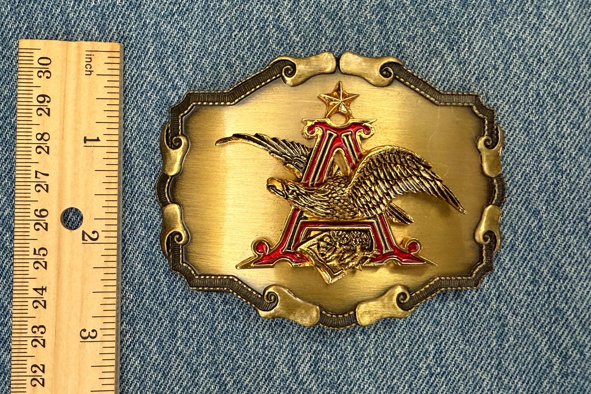 1970s–80s Anheuser-Busch Inc. belt buckle featuring the iconic A&Eagle logo in brass with red enamel detailing.