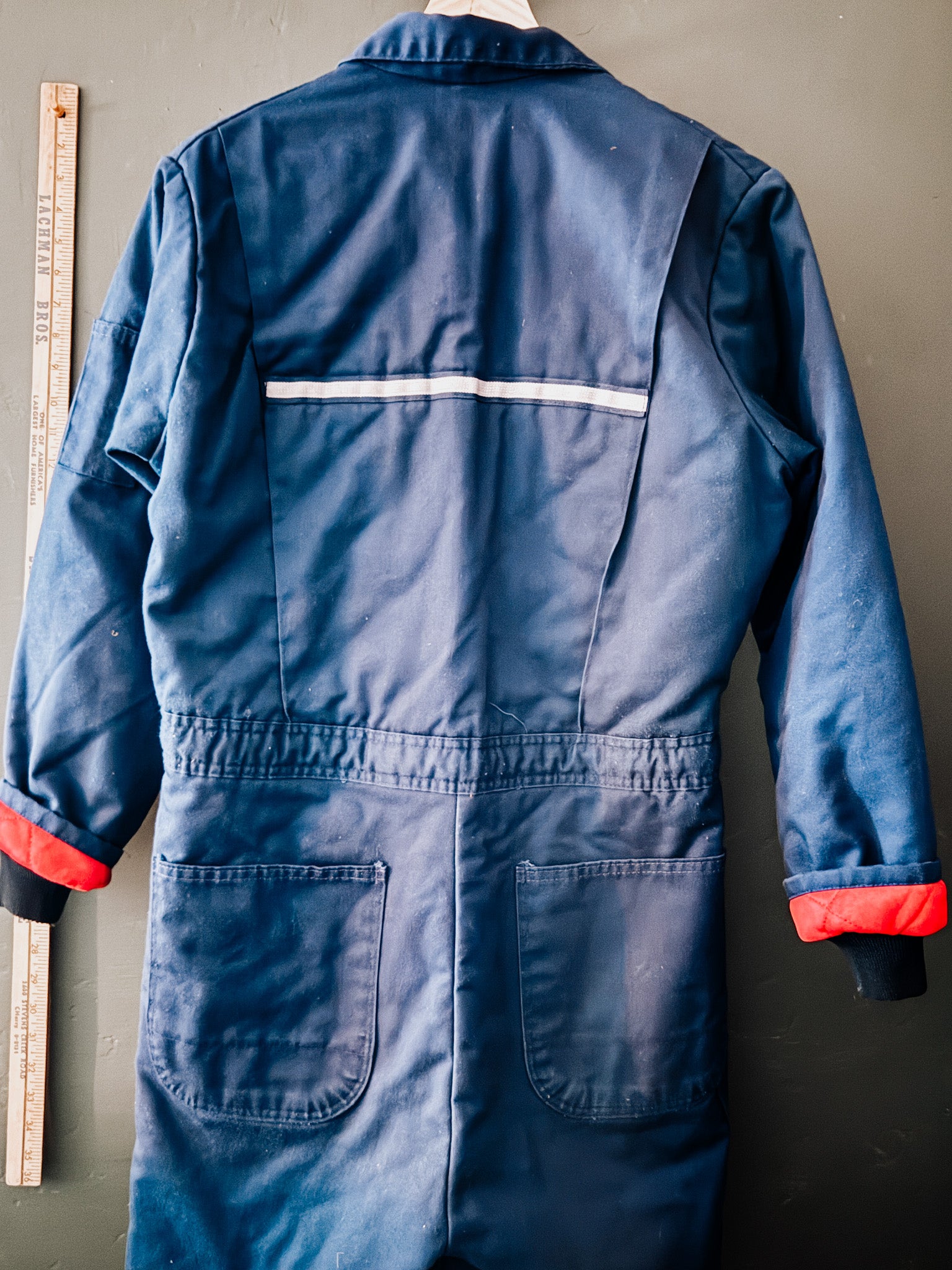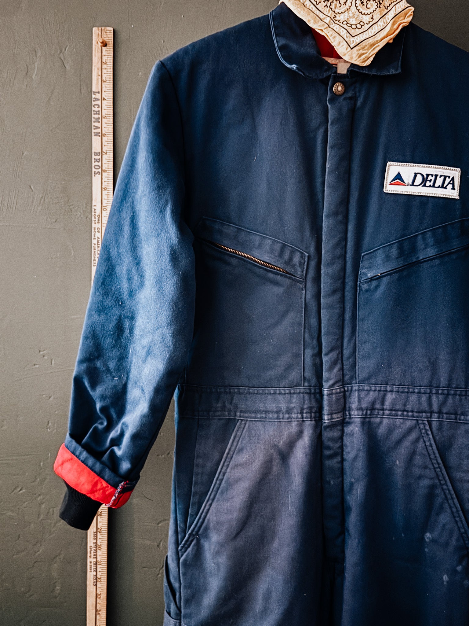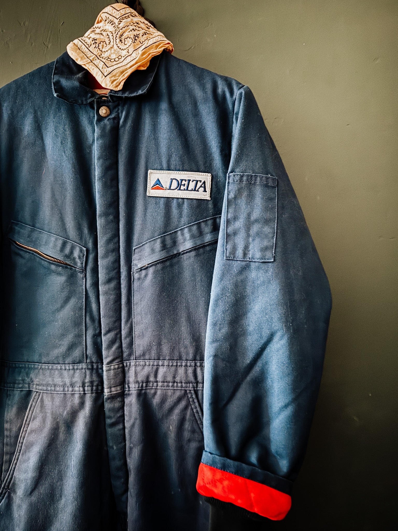 Classic vintage coveralls from DELTA Airlines by Berco Work Apparel. Made in the U.S.A. and fully insulated with red quilted lining. Heavy-duty brass zippers up the chest and both ankles. Perfectly worn with visible fading and minor imperfections that add to the authentic workwear character.