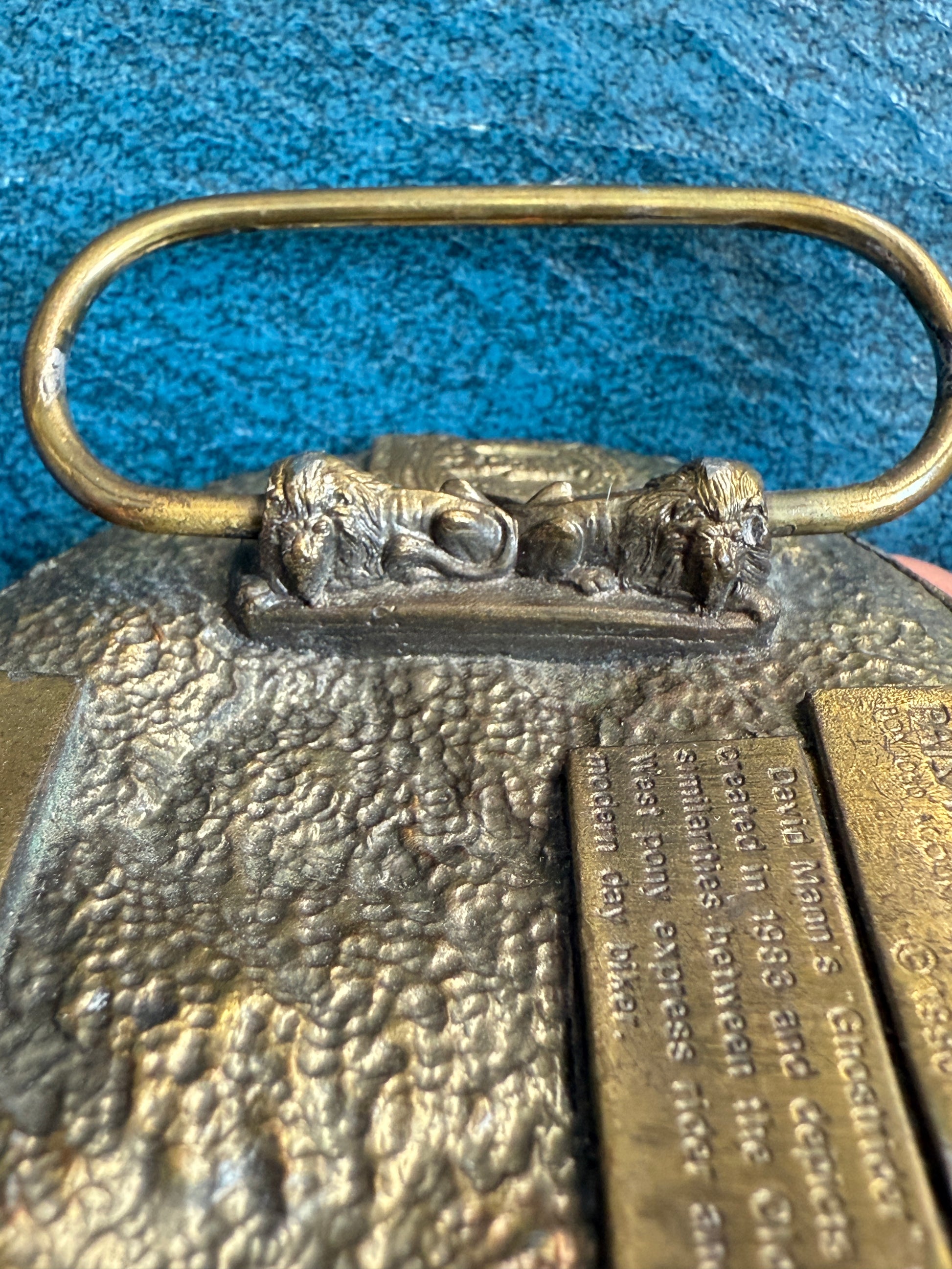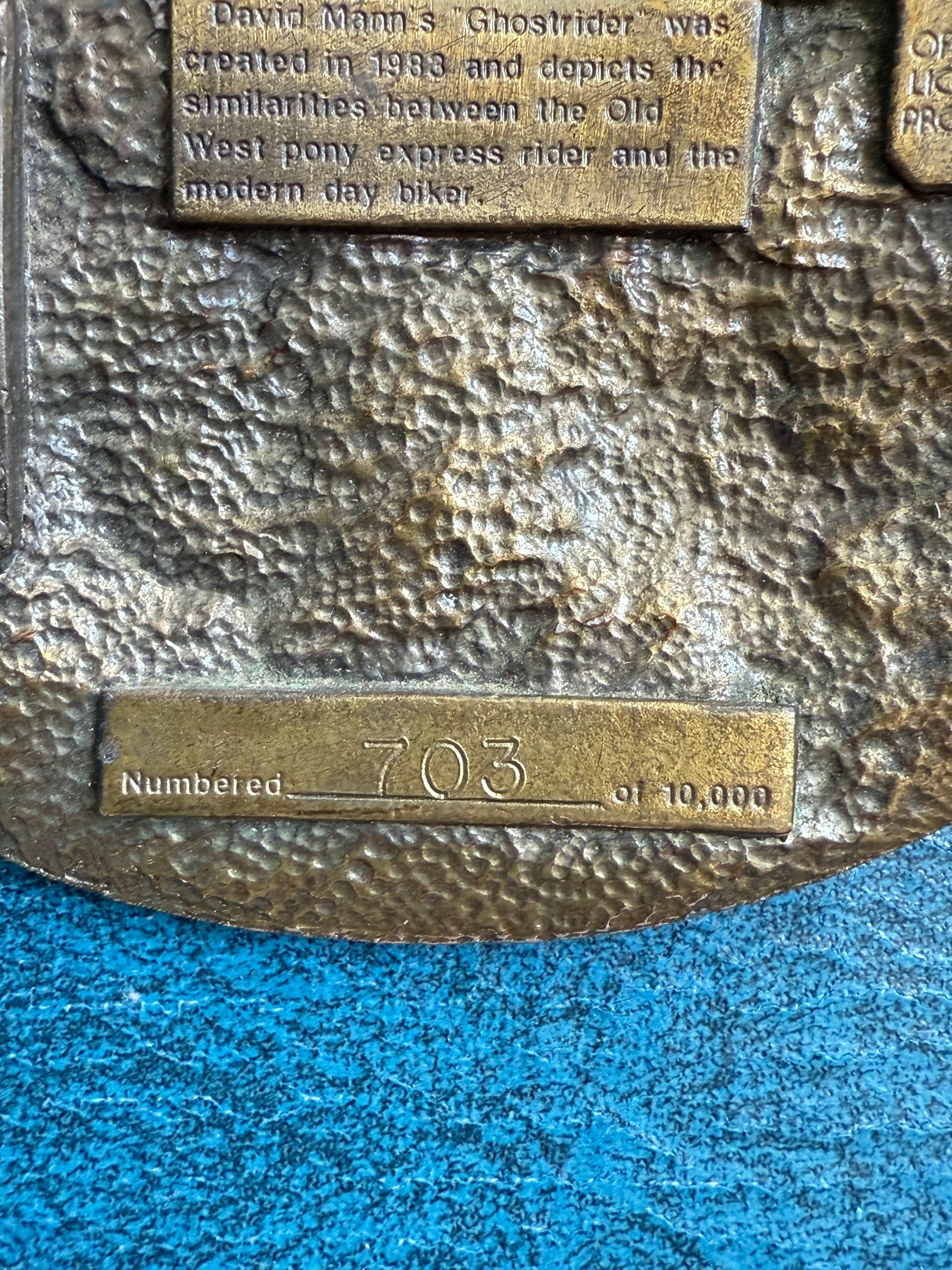 Rare 1983 Easyriders belt buckle featuring David Mann’s legendary “Ghostrider” artwork. Produced by Paisano Publications, this limited-edition buckle (#703 of 10,000) showcases a biker on a chopper alongside an Old West rider. A true collector’s piece for fans of vintage biker culture and motorcycle history.