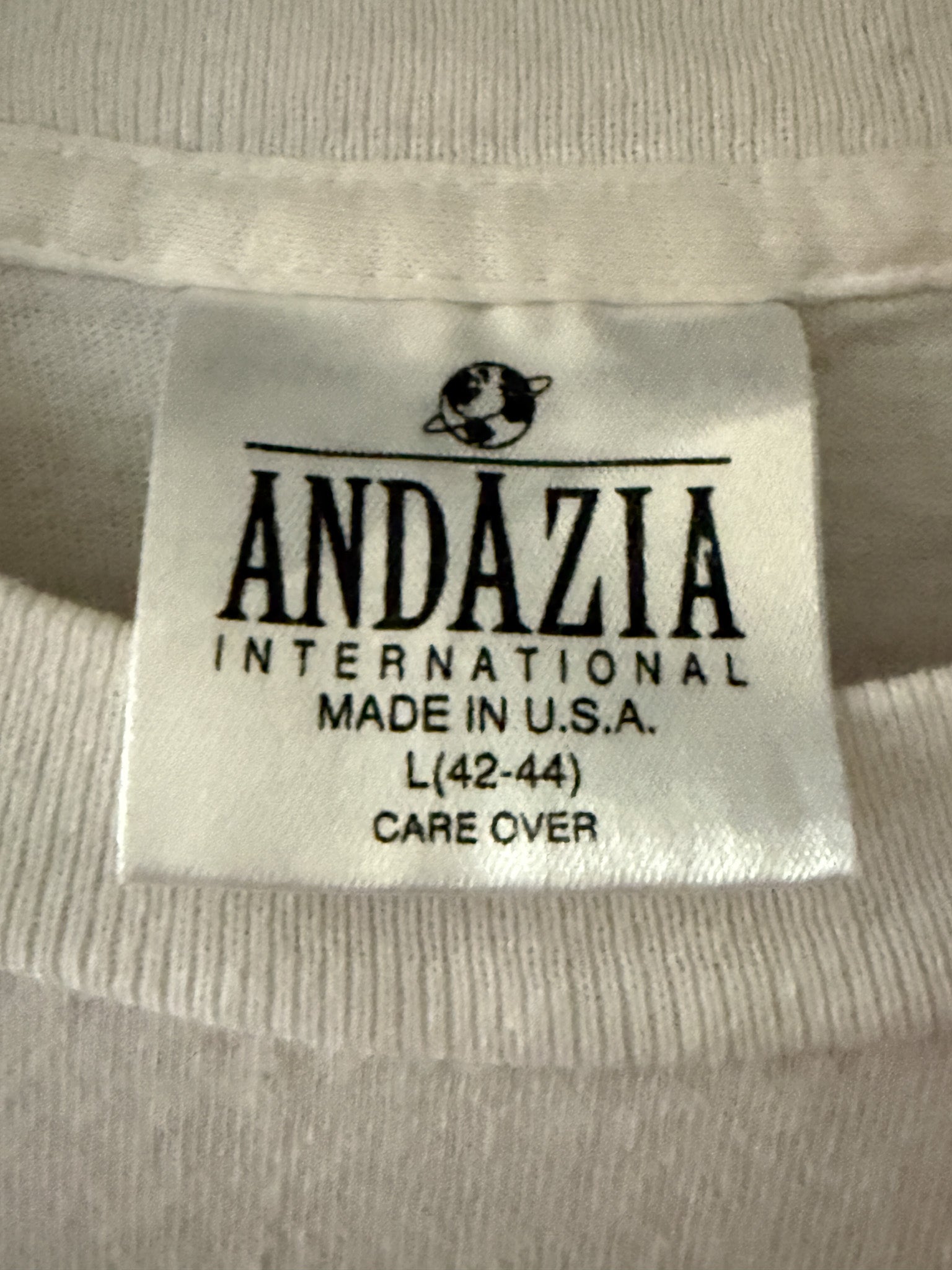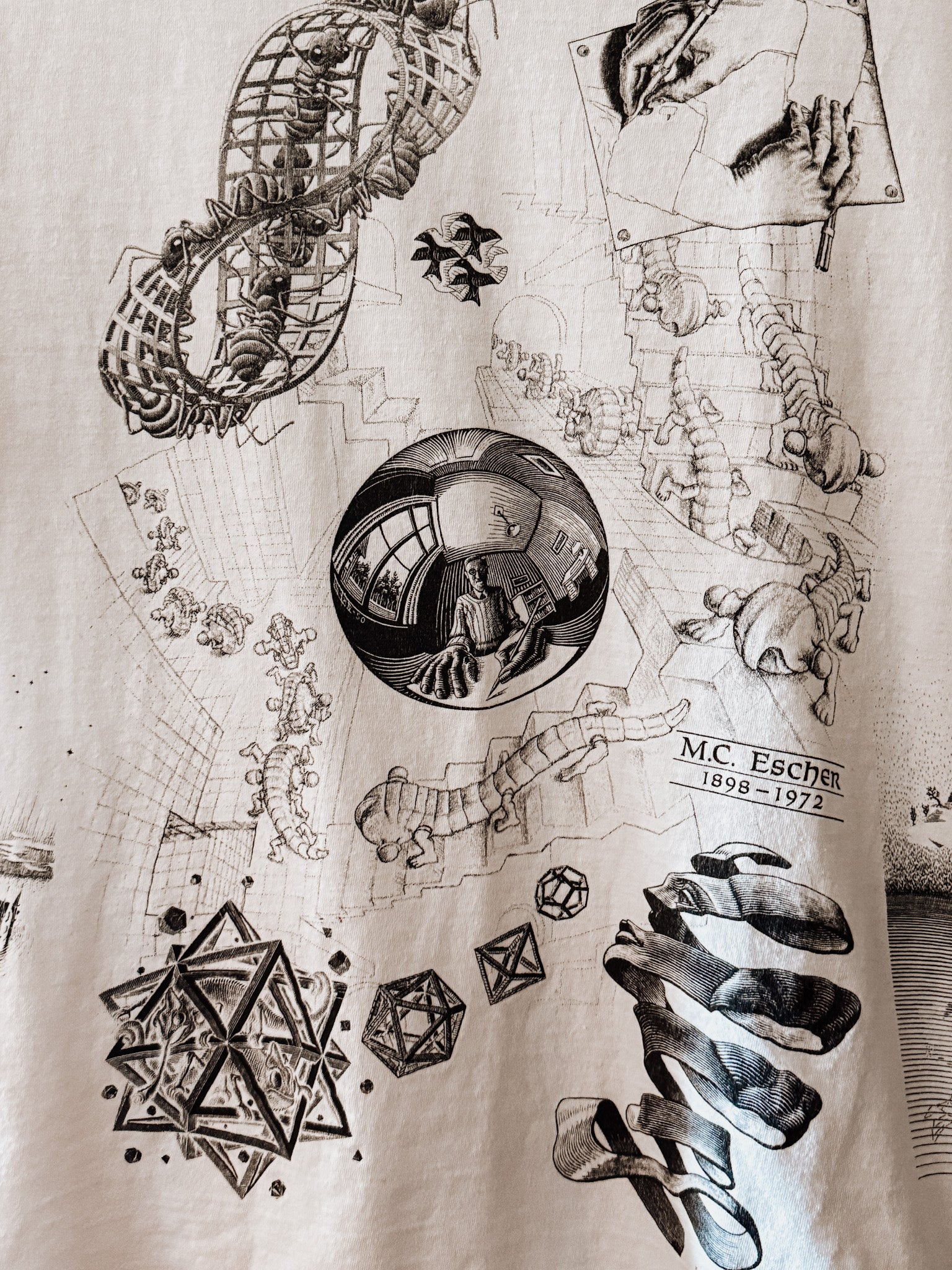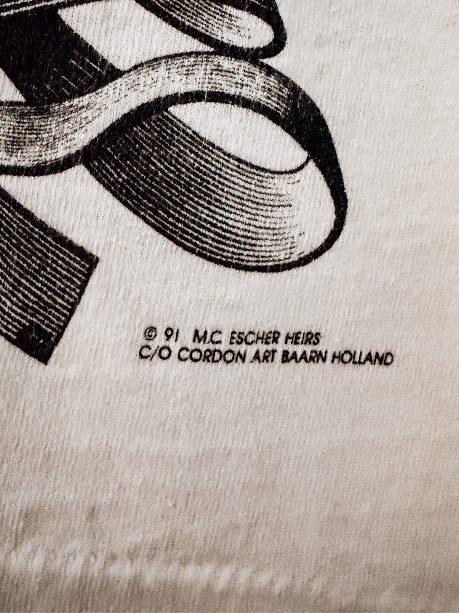 This tee is a piece of visual magic — a rare single‑stitch M.C. Escher print from 1991 under the Andazia label, made in the USA. No rips, no stains — just the right kind of fade that only vintage can give.