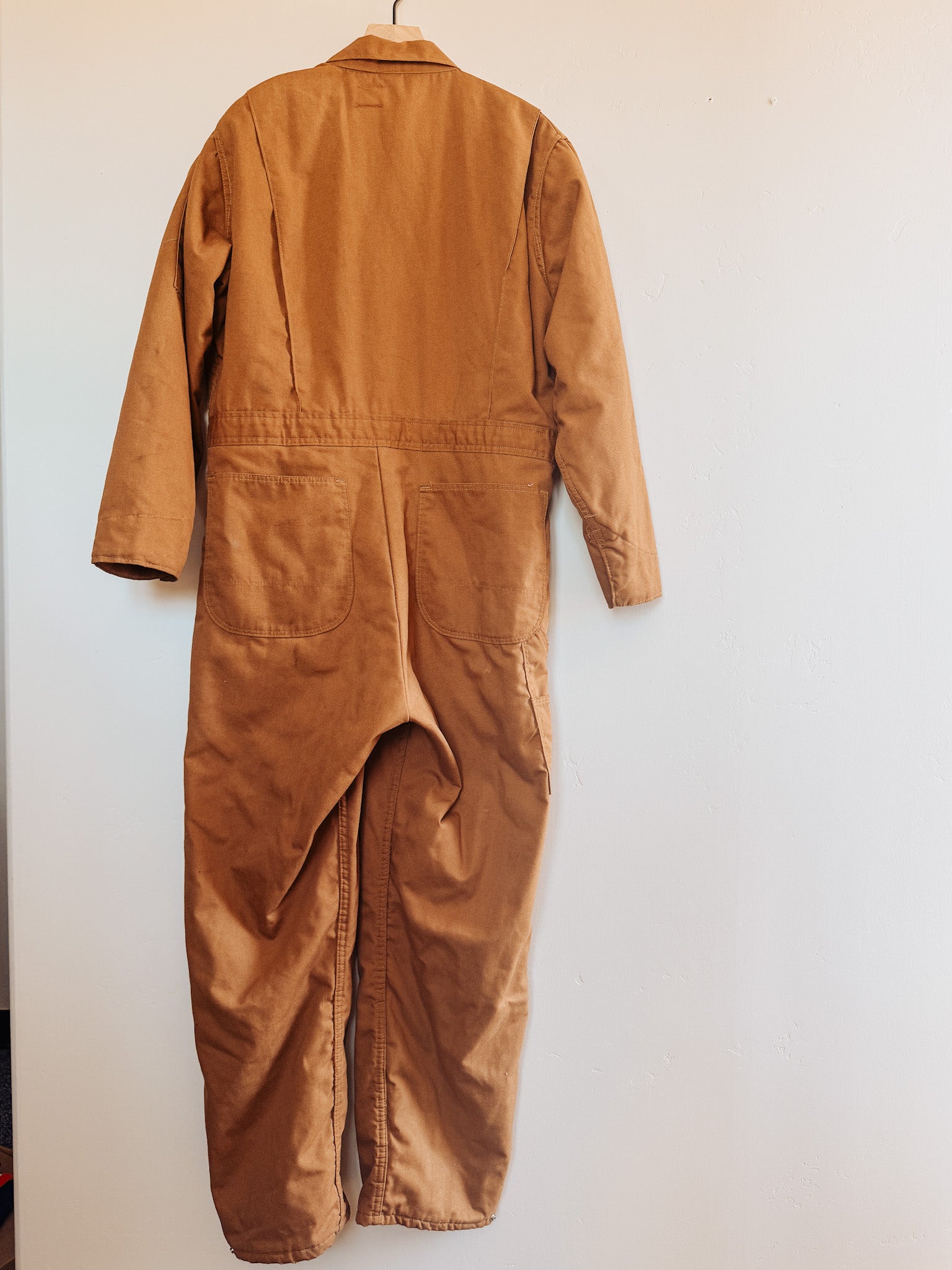 Classic insulated workwear from Big Ben by Blue Bell. These tan quilted coveralls bring serious utility vibes with diamond-stitch lining, heavy-duty metal zip chest pockets, and a rugged cotton shell built for real work—or real style.