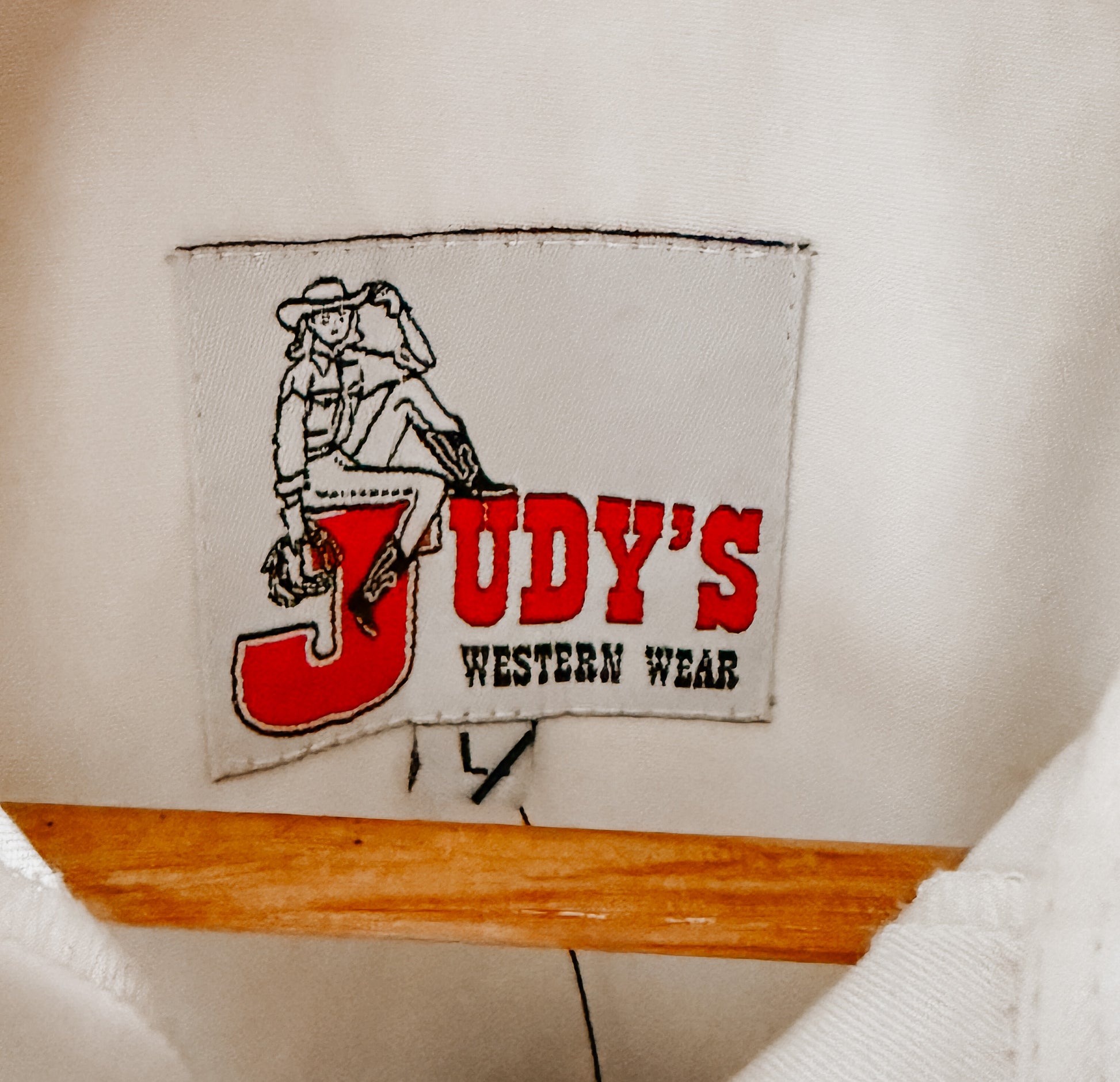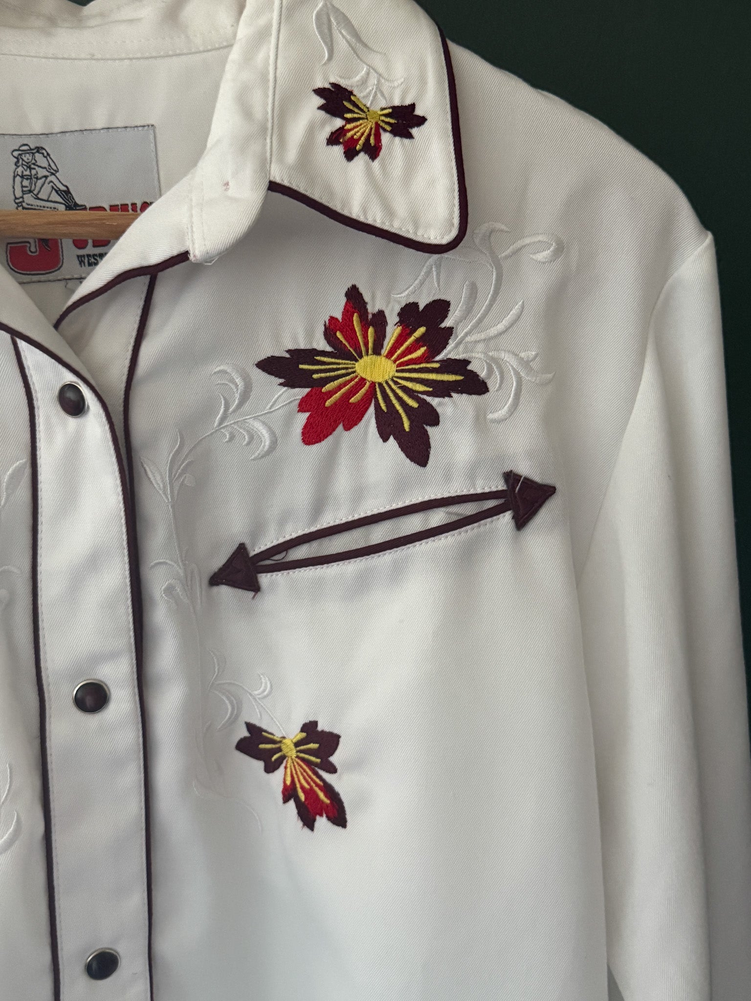 This vintage pearl-snap western shirt from Judy’s is everything we love — bold floral embroidery, classic arrow detailing, and piping that makes it pop just right. The white base sets off the deep red and brown thread-work beautifully, giving it a rich, retro Americana vibe.